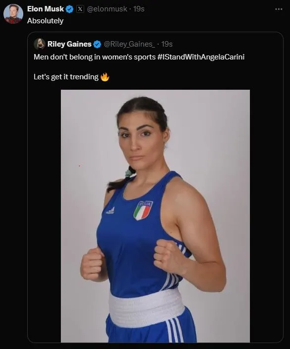 Tesla, SpaceX ve X gibi şirketlerin sahibi milyarder Elon Musk ise X sosyal medya platformunda "Erkeklerin, kadın sporlarında yeri yok." yazılı paylaşıma, "Kesinlikle" yorumunu yaptı.