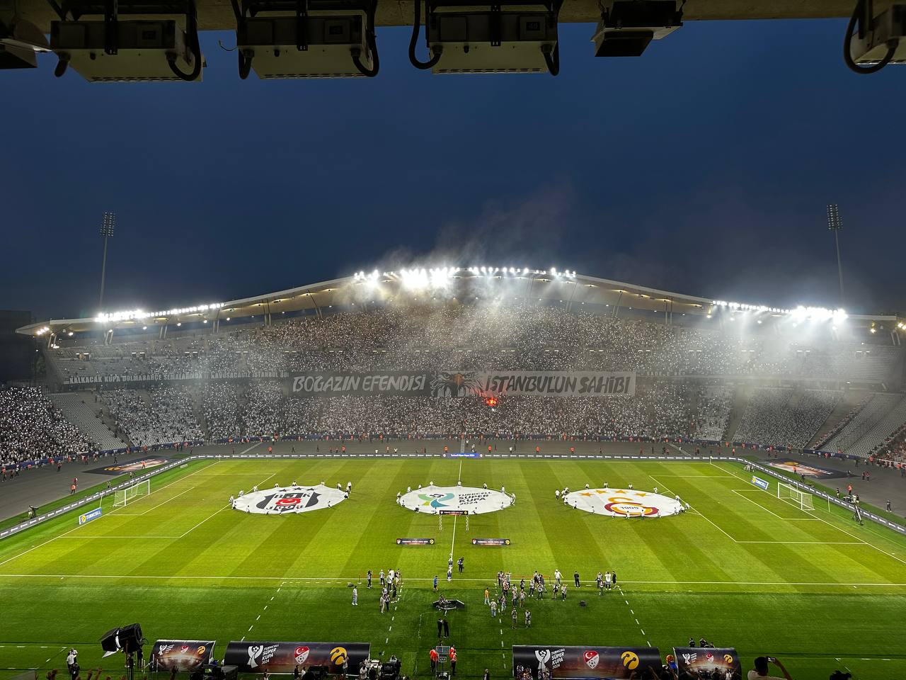 Galatasaray taraftarları Süper Kupa maçı öncesinde tüm ezeli rakiplerine karşı pankartlı göndermede bulundu. Siyah beyazlılar ise tribünün büyük kısmını kaplayan bir Boğazın efendisi, İstanbul'un sahibi pankartı ile cevap verdi...