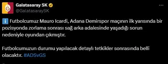 "Futbolcumuz Mauro Icardi, Adana Demirspor maçının ilk yarısında bir pozisyonda zorlama sonrası sağ arka adalesinde yaşadığı sorun nedeniyle oyundan çıkmıştır. Futbolcumuzun durumu yapılacak detaylı tetkikler sonrasında belli olacaktır."