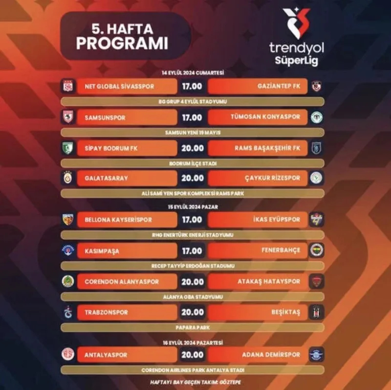 Süper Lig'de 5. ve 6. haftanın programları şöyle: