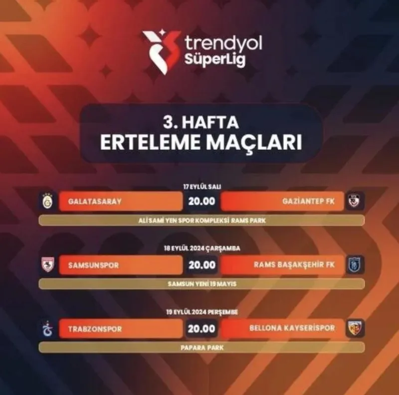 Süper Lig 3. hafta erteleme maçlarının programı şöyle: