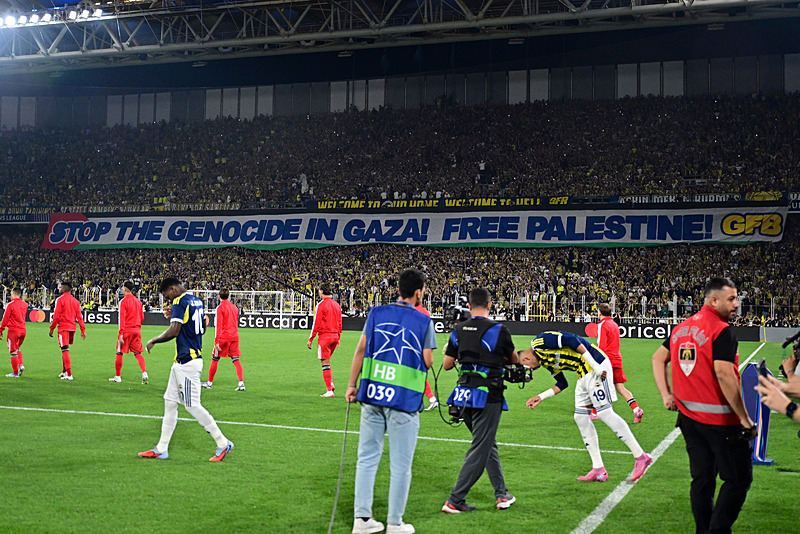 UEFA Şampiyonlar Ligi play-off turu ilk maçında Benfica'yı konuk eden Fenerbahçe'de taraftarlar, tribünlerde Filistin'e destek verdi. Kadıköy'de oynanan mücadelede sarı-lacivertli tribünler, Gazze'de yaşananlara dikkat çekmek amacıyla çarpıcı bir pankart açtı. Fenerbahçe taraftarlarının açtığı pankartta, "Gazze'deki soykırımı durdurun! Özgür Filistin!" ifadeleri yer aldı.