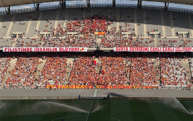 Galatasaray'ın Eyüpspor ile karşılaştığı randevuda tribünler yine Filistin'i unutmadı. Sarı kırmzılı taraftarlar, "Filistin'de insanlık ölüyor ve dünya soykırımı canlı canlı izliyor" pankartları astı.
