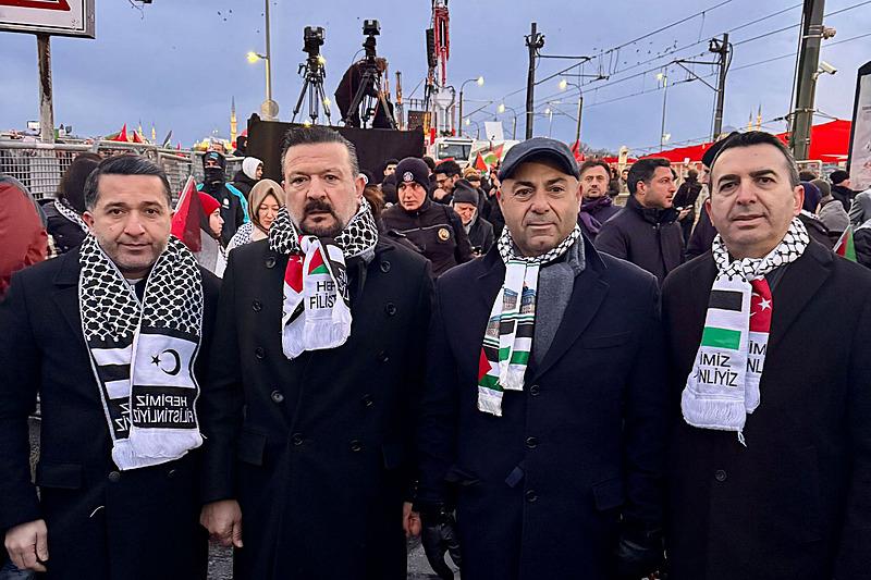 İnsanlık İttifakı ve Milli İrade Platformunca, Filistin'deki katliamın durdurulması amacıyla "Sinmiyoruz, susmuyoruz, Filistin'i unutmuyoruz" sloganıyla yapılan eyleme spor camiasından da yoğun bir katılım oldu. İstanbul'un 3 büyük kulübü, başkan ve yöneticiler nezdinde eyleme katıldı. Milli gururlar Taha Akgül ve Rıza Kayaalp Takvim.com.tr'ye konuştu. İşte o açıklamalar...