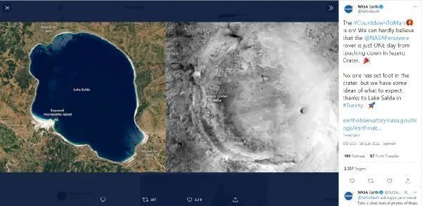 Salda Gölü ve Jezero Krateri'nin birlikte fotoğrafının yer aldığı paylaşımda, "Mars'a geri sayım başladı! NASA Persevere gezgininin Jezero Krateri'ne sadece bir gün sonra temas edeceğine inanmak öyle zor ki. Kratere kimse ayak basmadı ama Türkiye'deki Salda Gölü sayesinde neler bekleyebileceğimiz konusunda bazı fikirlerimiz var" denildi.