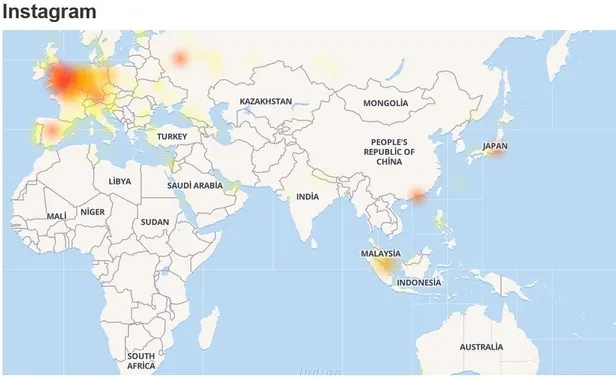 Canlı arıza haritası üzerinde Instagram sorunu şu şekilde görülüyor: