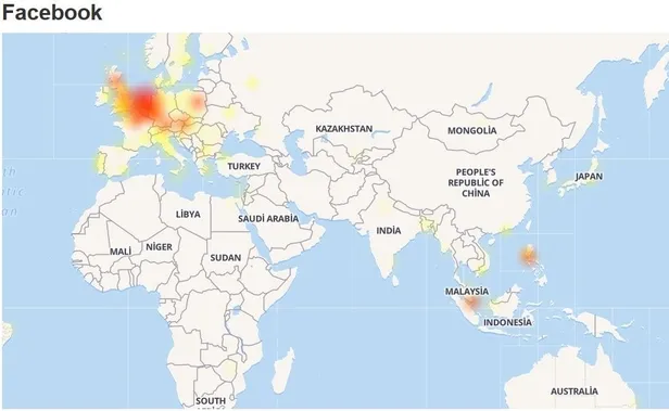 Canlı arıza haritası üzerinde Facebook sorunu şu şekilde görülüyor: