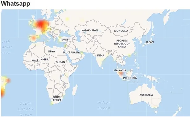 Canlı arıza haritası üzerinde WhatsApp sorunu şu şekilde görülüyor: