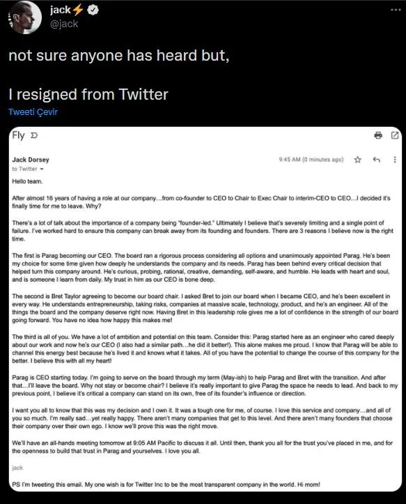 Amerika basını Twitter CEO’su Jack Dorsey’in, CEO’luk görevinden istifa etmesinin beklendiğini birdirmişti. Twitter CEO'su Jack Dorsey'in görevinden istifa ettiği açıklandı. Dorsey, Twitter hesabından yaptığı açıklama ile istifasını doğruladı. Dorsey’in istifa ettiğinin açıklanmasının ardından yerine Parag Agrawal'ın atandığı duyuruldu.