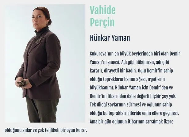 Çukurova'nın en büyük beylerinden biri olan Demir Yaman'ın annesi. Adı gibi hükümran, adı gibi kararlı, dirayetli bir kadın. Oğlu Demir'in sahip olduğu toprakların hanım ağası, ırgatların büyükhanımı. Hünkar Yaman için Demir'den ve Demir'in itibarından daha değerli hiçbir şey yok.