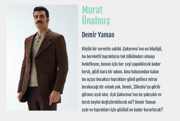 Büyük bir servetin sahibi. Çukurova'nın en büyüğü, bu bereketli toprakların tek hükümdarı olmayı hedefleyen, bunun için her şeyi yapabilecek kadar hırslı, gözü kara bir adam. Ama babasından kalan bu uçsuz bucaksız toprakları günü gelince miras bırakacağı bir evladı yok. Demir, Züleyha'ya görür görmez aşık olur. Aşk Çukurova'nın bu yakışıklı ve hırslı beyini değiştirebilecek mi? Demir Yaman aşkı ve toprakları için gözünü ne kadar karartacak?