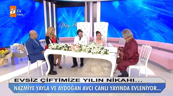 Müge Anlı 31 Aralık Pazartesi günü canlı yayında, evsiz kalan Nazmiye ve Aydoğan çiftinin nikahlarını kıydı. Nazmiye Yayla ve Aydoğan Avcı, 4 Aralık günü Müge Anlı ile Tatlı Sert stüdyosuna gelerek sokakta kaldıklarını söylemişti. Çift evli değildi ve Nazmiye Yayla 8 aylık hamileydi. Müge Anlı çifte yardım eli uzattı ve yılın son günü çiftin nikahı Beyoğlu Belediye Başkanı Ahmet Misbah Demircan tarafından Müge Anlı ile Tatlı Sert canlı yayınında kıyıldı. İşte, 31 Aralık Müge Anlı canlı yayınında yaşanan o anlar...
