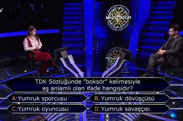 Her hafta pazartesi ve cumartesi günleri Atv ekranlarında yayınlanan Kim Milyoner Olmak İster yarışması yine izleyicileri ekran başına kitledi. Murat Yıldırım'ın sunuculuğunu yaptığı yarışmada "TDK sözlüğünde boksör kelimesiyle eş anlamlı olan ifade hangisidir?" sorusu yarışmacıya yönetildi. Birçok kişi şimdi bu sorunun yanıtını merak ediyor. Peki, TDK sözlüğünde boksör kelimesiyle eş anlamlı olan ifade hangisidir? İşte cevabı...