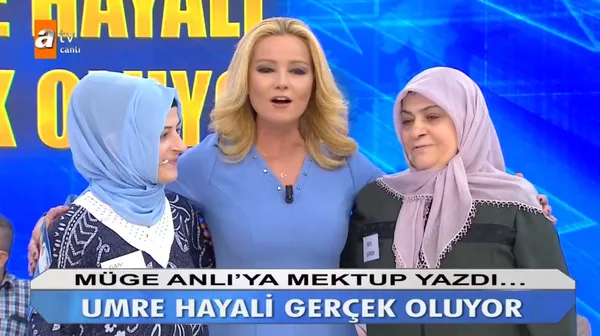 Müge Anlı, çözüme kavuşturduğu dosya haberlerin yanı sıra iyiliği hedefleyen sosyal sorumluluk projeleriyle de kendisinden söz ettirmeye devam ediyor. Atv ekranlarında hafta içi her gün yayınlanan Müge Anlı ile Tatlı Sert programında bugün, Sancaktepe'de yaşayan Satı Şimşek'in, Umre hayali gerçek oldu. Müge Anlı, Ramazan Ayı'na özel iyilik hareketi başlattı. Önceki yayınında; "Bana hayalinizi yazın. Ben de bu kutsal ayda her gün bir hayali gerçekleştireyim" demişti. Ramazan'ın ilk gününde ilk hayali gerçeğe dönüştüren Anlı, Satu Şimşek'i Umre'ye gönderiyor.