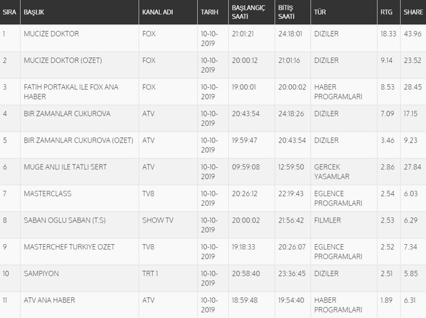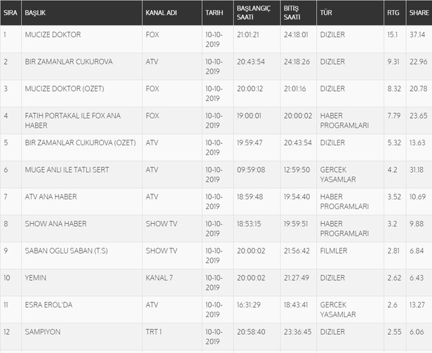 10 Ekim reyting sonuçları için diğer sayfaları ziyaret ediniz...