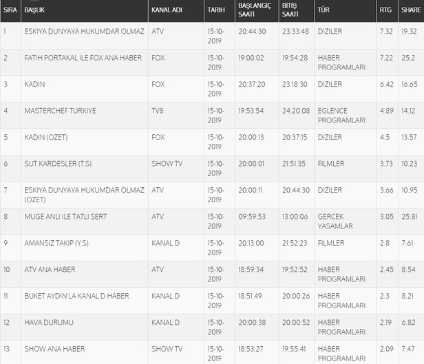 15 Ekim reyting sonuçları: Eşkıya Dünyaya Hükümdar Olmaz, Kadın dizileri reyting sonuçları listesi!
