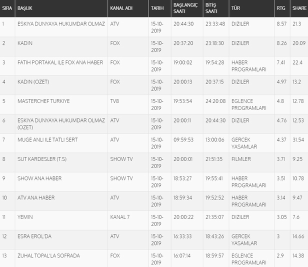 Reyting sonuçları, günün en çok aranılanları arasında yer alıyor. Atv'nin fenomen dizisi Eşkıya Dünyaya Hükümdar Olmaz'ın reyting sonucu için diziseverler araştırmalarını sürdürüyor. Güçlü oyuncu kadrosu ve sürükleyici hikayesiyle salı akşamlarının vazgeçilmez dizisi Eşkıya Dünyaya Hükümdar Olmaz, Total'de RTG 8.57 Share 21.3, AB'de RTG 7.32 Share 19.32, 20+ABC1 kategorisinde RTG 9.03 ve Share 20.89 ile birinci oldu. Peki, dünkü reyitng sonuçlarında son durum nedir? İşte 15 Ekim Eşkıya Dünyaya Hükümdar Olmaz, Kadın dizileri reyting sonuçları listesi...