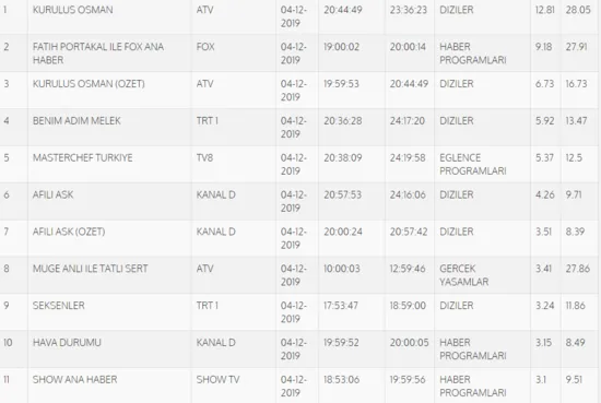 Total'de 1.sırada ATV'de yayınlanan "Kuruluş Osman", 2.sırada "Kuruluş Osman"ın özeti, 3.sırada "Fatih Portakal ile Fox Ana Haber" yer aldı. AB'de ise 1.sırada "Kuruluş Osman", 2.sırada "Fatih Portakal ile Fox Ana Haber", 3.sırada "Kuruluş Osman"ın özeti yer aldı.