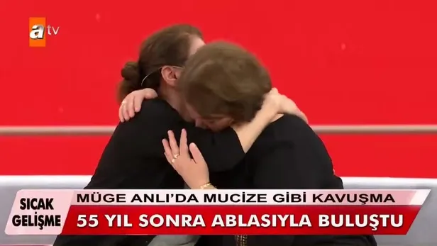 Çok geçmeden müjdeli haber geldi. Dün yayına bağlanan telefonun diğer ucunda Hülya Ertaş'ın 55 yıldır görmediği ablası vardı. Abla, seni hep aramak istedik annem de ben de ama düzenini bozmak istemedik. Babam yıllar önce vefat etti, annemi ise iki yıl önce kaybettik dedi. Yıllar sonra kardeşini ilk kez ekranda gören abla, bugün canlı yayına gelerek kız kardeşine gözyaşları içinde sarıldı ve bir daha ayrı kalmayacaklarının sözünü verdi.