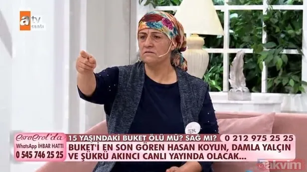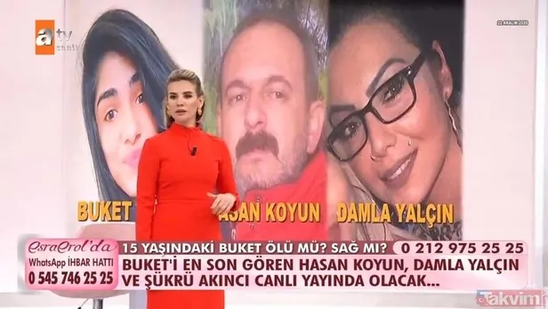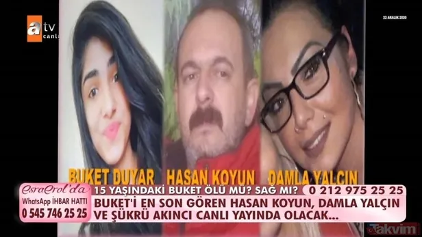 ATV ekranlarında izlenme rekorları kıran Esra Erol'da canlı yayınında Türkiye'nin gündemine bomba gibi düşen bir olay yaşandı. Meral Duyar'ın 15 yaşındaki kızı Buket Duyar, 22 Kasım'dan bu yana kayıptı... Anne Meral Duyar, kızının evden kaçıp kaçıp 32 yaşındaki Damla Yalçın'ın evinde kaldığını belirtti. Canlı yayına bağlanan Damla Yalçın, Buket'in Şükrü Akıncı ile evine geldiğini ve 5 kereden fazla görmediğini iddia etti.