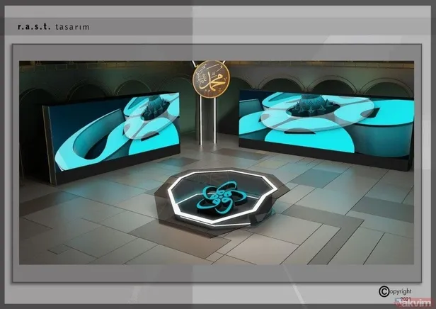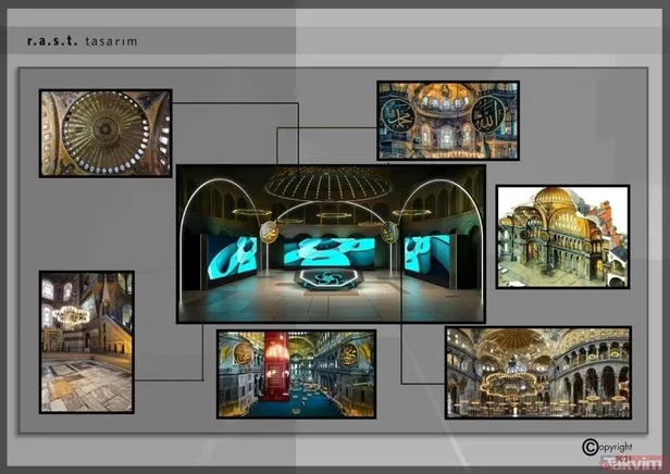 TASARIMCI ERSİN TUNÇAY: Tasarıma başlarken Ayasofya'yı ancak simgesel anlamlarda taklit etmeliyiz diye düşündük. Her bir revağı sadece ışık kutusu ile tanımladık. Ardından orta kubbeyi aslına uygun ama genel tanımlamaları yine ışık ile yaptık. Her sene mutlaka ziyaret ettiğim Ayasofya'nın en akılda kalan özelliği hat levhalarıdır. Onları çok değiştirmeden kullandık.