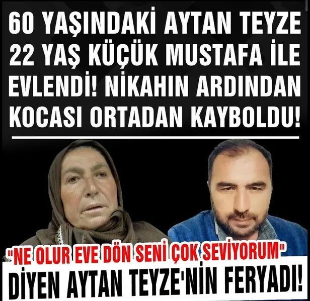 60 yaşındaki Ayten Teyze kendisinden 22 yaş küçük Mustafa ile evlendi! Nikahın ardından kocası ortadan kayboldu! "Ne olur eve dön seni çok seviyorum" diyen Ayten Teyze'nin feryadı!