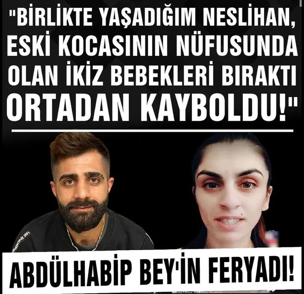 "Birlikte yaşadığım Neslihan, eski kocasının nüfusunda olan ikiz bebekleri bıraktı ortadan kayboldu!" İkiz bebeklerle yapayalnız kalan ve Neslihan'ın ailesinin desteğiyle ayakya durmaya çalışan Abdülhabip Bey'in feryadı!