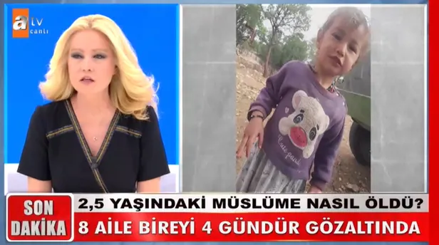 Minik Yörük kızı Müslüme'nin ölümüne ilişkin son dakika haberini açıklayan Müge Anlı, dedenin tutuklandığını ve mahkeme kararına göre yıl sonuna kadar konuyla ilgili yayın yasağı geldiğini ifade etti.