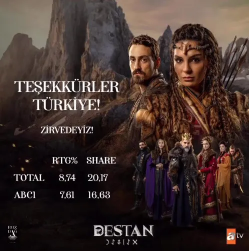 Destan'ın ekran yolculuğu zirvede başladı ilk bölümüyle hem gönülleri hem reytingleri fethetti! Destan' 2. yeni bölüm fragmanı... Ekranların yeni fenomeni 'Destan', merakla beklenen ilk bölümüyle atv ekranında izleyiciyle buluştu ve gördüğü büyük ilgi ile ekran yolculuğuna muhteşem bir başlangıç yaptı. #DestanDizisi etiketiyle sosyal medyada Türkiye'de ve dünya gündeminde yer alan 'Destan', reytinglerde de tüm rakiplerini geride bıraktı. İşte Destan'ın reyting sonuçları...
