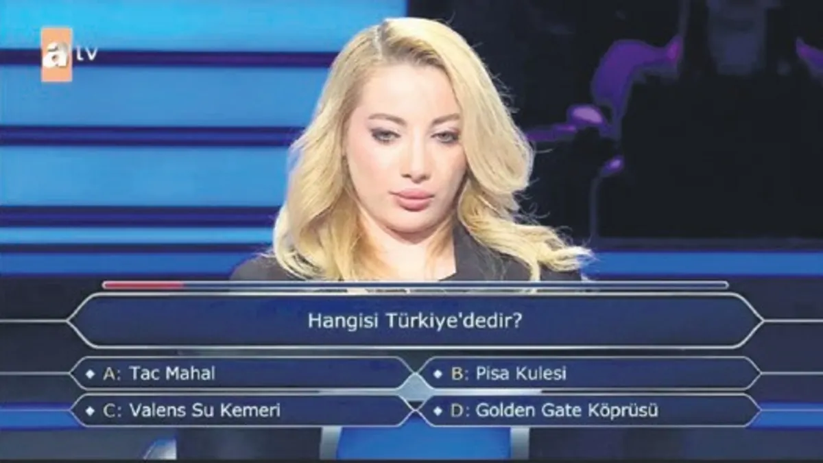Atv ekranlarında yayınlanan “Kim Milyoner İster” yarışmasına katılan Nesrin Ulus isimli yarışmacıya, 10 bin TL değerindeki dördüncü soru olarak “Hangisi Türkiye’dedir?” sorusu yöneltildi. Şıklar arasında Tac Mahal, Pisa Kulesi, Valens Su Kemeri ve Golden Gate Köprüsü yer aldı.