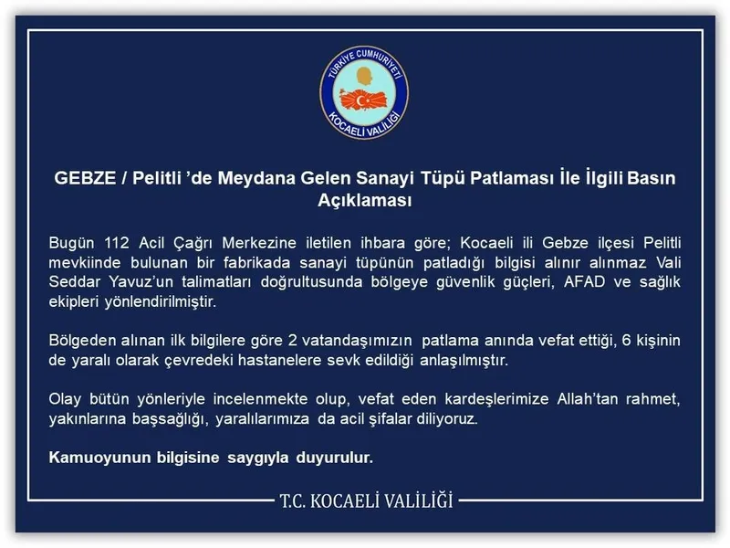 Bugün 112 Acil Çağrı Merkezine iletilen ihbara göre; Kocaeli ili Gebze ilçesi Pelitli mevkiinde bulunan bir fabrikada sanayi tüpünün patladığı bilgisi alınır alınmaz Vali Seddar Yavuz'un talimatları doğrultusunda bölgeye güvenlik güçleri, AFAD ve sağlık ekipleri yönlendirilmiştir.