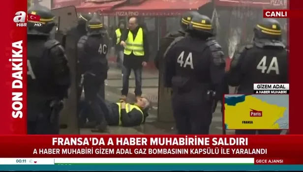 Fransız polisi başkent Paris'teki olayları haber yapmak için olay yerinde bulunan A Haber muhabiri Gizem Adal'a gaz bombası ile saldırdı. Adal, 'Basın mensubu olduğumuzu söylememize rağmen Fransız polisi bunu umursamadı ve beni yaraladı' dedi. Her fırsatta basın özgürlüğünden bahseden Avrupa bu olay ile bir kez daha iki yüzlülüğünü ortaya koymuş oldu. İşte saldırı anına ait görüntüler...