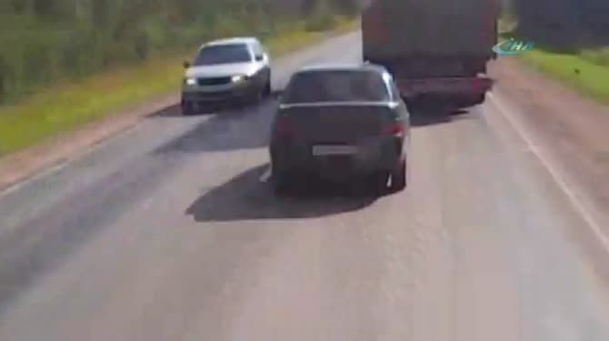 Rusya’da çekilen görüntülerde bir aracın otoyolda seyrettiği görülüyor. Önünde ilerleyen TIR’ı sollamak için fırsat kollayan araç sürücüsü, uygun anı bulduğunu sanarak sol şeride geçiyor. O sırada karşı taraftan gelen kamyonet, otomobile böyle çarpıyor.