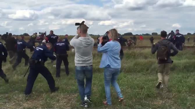Macaristan'da bir kadın kameraman kucağında oğlu ile polisten kaçmaya çalışan göçmen babayı, çelme atarak yere düşürdü. Çalıştığı televizyon kanalı kameramanın görevine son verdi.