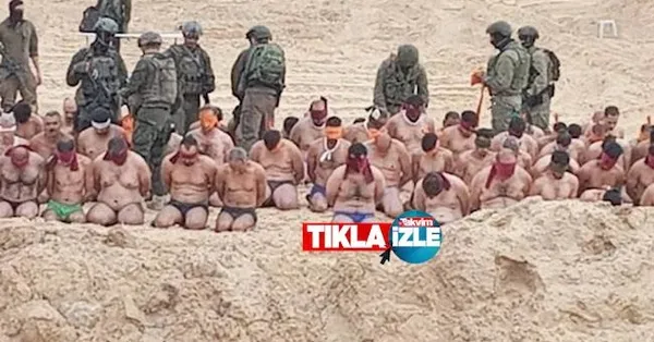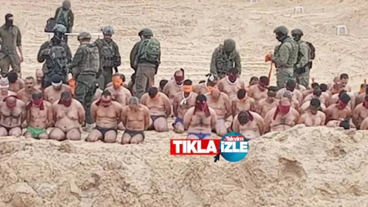 Gazze'de 17 bini aşkın kişiyi katleden katil İsrail'in zulmünü gözler önüne seren bir yeni görüntü daha geldi. Tel Aviv'in katil ordusu, Gazze'de onlarca sivil erkeği soyup ellerini ve gözlerini bağladı. Öte yandan söz konusu görüntülerde tutuklanan ve kıyafetleri soyulan Filistinlilerin önündeki çukur nedeniyle infaz edilmeden önceki görüntüler olduğu iddia edildi.