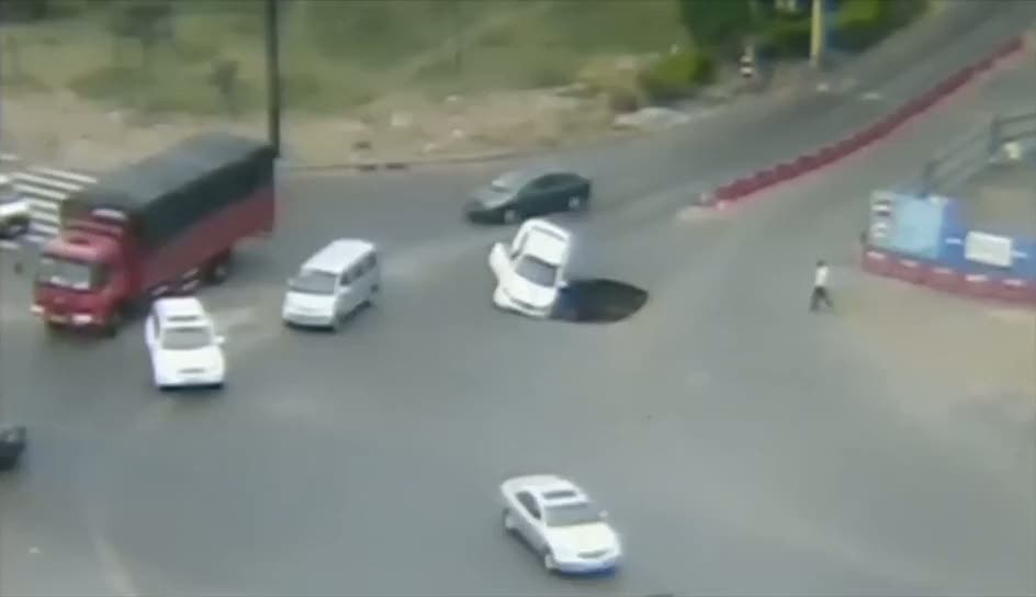 Çin'de kaydedilen görüntülerde yolun ortasında asfaltın çökmesinden kaynaklanan büyük bir çukur aracı yuttu. Dönmeye çalışan beyaz renkli otomobil çukuru fark edemedi ve içine düştü. Saniyelerle araçtan çıkan sürücü herhangi bir zarar görmedi.