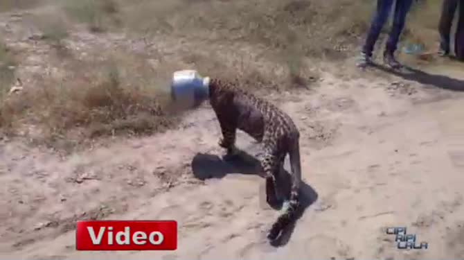 Hindistan’da susuz kalan bir leopar su arayışına çıktığı bir köyde kafasını metal bir çömleğin içine sıkıştırdı. 6 saat boyunca bu şekilde gezen leopar uzun uğraşlar sonucu kurtarıldı