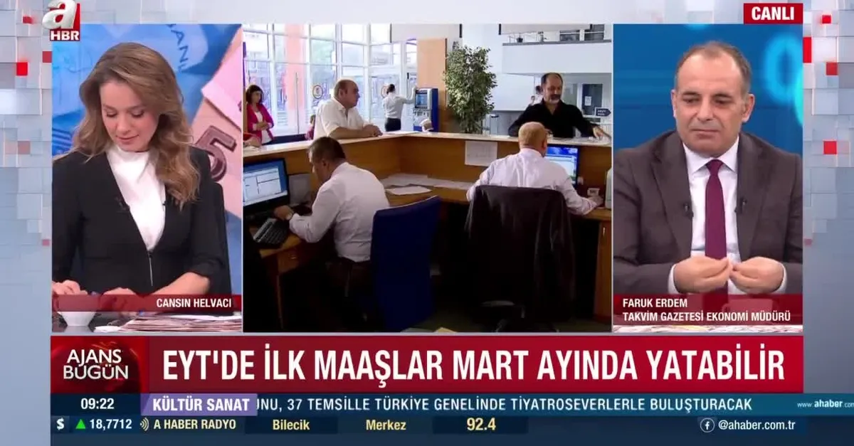AK Parti Grup Başkanvekili ve AK Parti Çanakkale Milletvekili Bülent Turan, "EYT ile ilgili çalışmalarımız olacak. Şubat'ın ortalarına kadar geçmesini umut ediyorum. En geç Mart ayında maaşlar yatacak diye düşünüyorum" dedi. Öte yandan Takvim Gazetesi Ekonomi Müdürü Faruk Erdem, A Haber ekranlarında konuya ilişkin önemli değerlendirmelerde bulundu.
