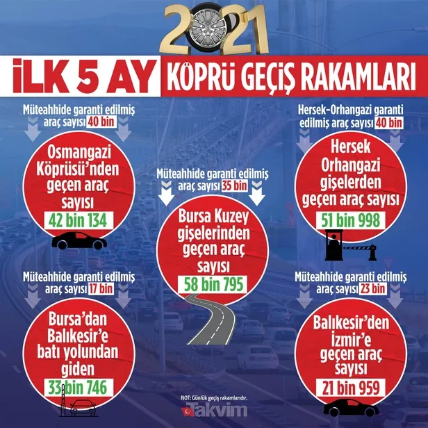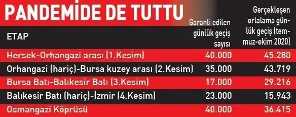 Karayolları Genel Müdürlüğü'nün resmi verilerine göre, İzmir-İstanbul Otoyolu'nun birinci kesimini içeren Hersek-Orhangazi arasında haziranda günlük ortalama geçişler 42 bin 176'yı buldu. Devletin garantisi olan 40 binin üzerine çıkıldı. Otoyolun Orhangazi-Bursa kuzey arasındaki bölümünde ise garantiyi karşılama oranı yüzde 128'e ulaştı. Haziranda garanti edilen araç sayısı günlük 35 bin araç olarak belirlenen kesimden, 45 bine yakın araç geçti. Bursa Batı-Balıkesir Batı arasındaki üçüncü kesim ise en çok kullanılan bölüm oldu. Devlet bu kesim için 17 bin araç geçiş garantisi vermişti. Bu kesimde günlük ortalama araç sayıları 24 bini aştı. Neredeyse garantiyi karşılama oranı yüzde 143'leri buldu. Otoyolda garanti araç sayısını haziranda tek tutturamayan kesim Balıkesir Batı ve İzmir arasındaki bölüm oldu. Ancak orada dahi pandemiye rağmen garanti edilen geçiş sayısının yüzde 71'ine ulaşıldı.