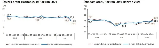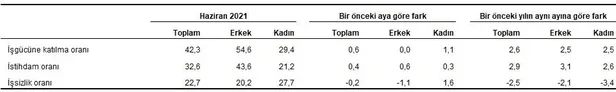 Son dakika haberi... Türkiye genelinde 15 ve daha yukarı yaştaki kişilerde işsiz sayısı 2021 yılı Haziran ayında bir önceki aya göre 823 bin kişi azalarak 3 milyon 399 bin kişi oldu. İşsizlik oranı ise 2,5 puanlık azalış ile yüzde 10,6 seviyesinde gerçekleşti. Atıl işgücü oranı ise 2021 yılı Haziran ayında bir önceki aya göre 4,7 puan azalarak yüzde 22,4 oldu.