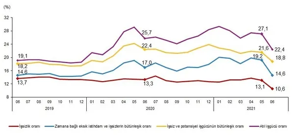 Zamana bağlı eksik istihdam, potansiyel işgücü ve işsizlerden oluşan atıl işgücü oranı 2021 yılı Haziran ayında bir önceki aya göre 4,7 puan azalarak %22,4 oldu. Zamana bağlı eksik istihdam ve işsizlerin bütünleşik oranı %14,6 iken, potansiyel işgücü ve işsizlerin bütünleşik oranı %18,8 olarak gerçekleşti.