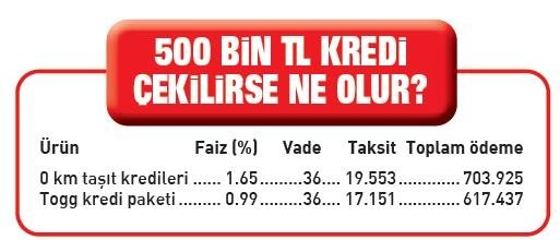 Kamu bankalarının yeni Togg kredi paketi vatandaşa hem aylık taksit ödemelerinde hem de toplam ödenecek tutarda ciddi avantaj sağlayacak.500 bin TL kredi çekildiğinde aylık taksit 17 bin 151 TL olacak. Toplam ödeme ise 617 bin 437 TL'yi bulacak.Ancak aynı miktarda krediyi mevcut bankaların verdiği oranlarda çektiğinizde aylık ödeme miktarı 20 bin TL'ye yaklaşıyor.Toplam ödeme ise 700 bin TL'yi buluyor.Böylece, 500 bin TL'lik kredide vatandaşın taksit ödemelerinde yaklaşık 3 bin TL toplam kredi ödemesinde ise 86 bin TL cebinde kalacak.