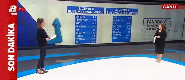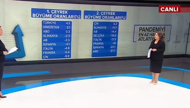 A Para Genel Yayın Yönetmeni Özlem Doğaner:Rakamları şöyle değerlendirmek lazım. 2. Çeyrek tam olarak aslında evlere kapandığımız dönem pandeminin olduğu süreci gösteriyor. Bütün dünyada pandemi etkisi var tüm dünyayı sarsmış durumda Türkiye bu noktada pandemiyi daha az hasarla atlatıyor bunu net bir şekilde görüyoruz.