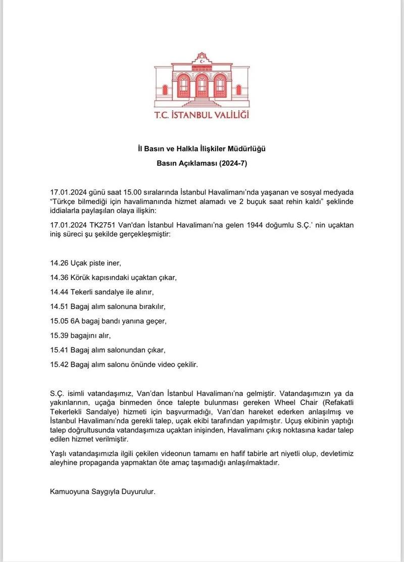 Valilik, 17 Ocak'ta saat 15.00 sıralarında İstanbul Havalimanı'nda yaşanan ve sosyal medyada "Türkçe bilmediği için havalimanında hizmet alamadı ve 2 buçuk saat rehin kaldı" şeklindeki iddialara ilişkin açıklama yayımladı.