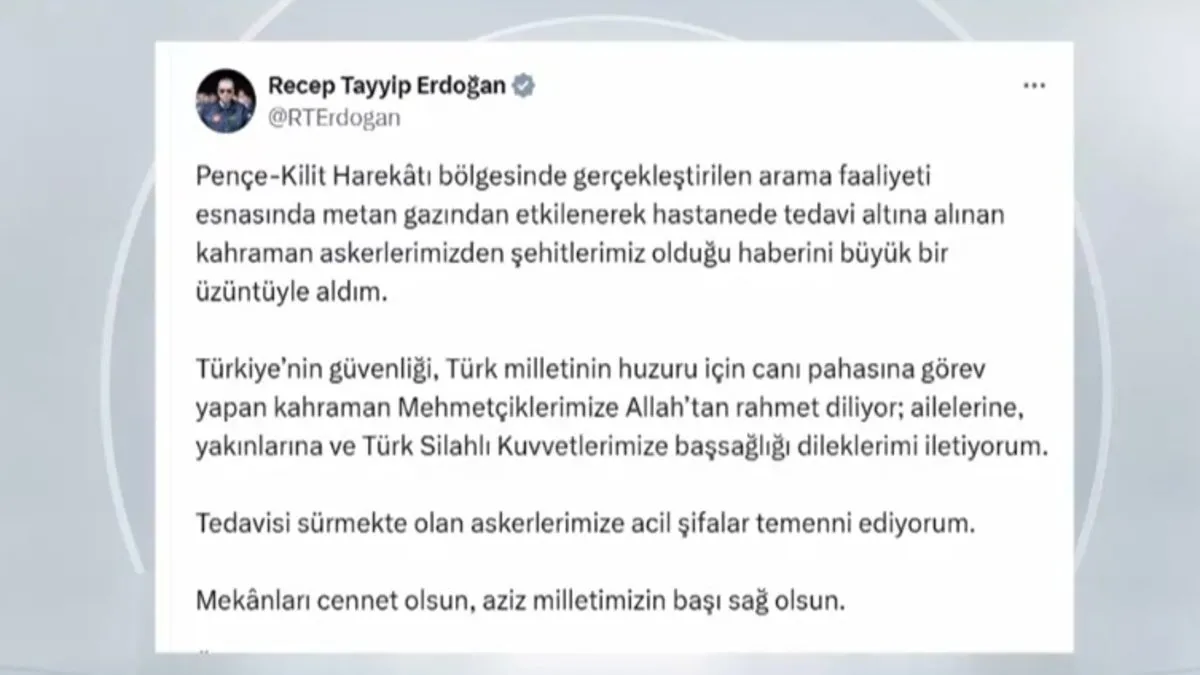 Milli Savunma Bakanlığı, Pençe Kilit bölgesinde 2022'de şehit düşen P. Ütğm. Nuri Melih Bozkurt'un naaşını arayan 19 Mehmetçik'in metan gazına maruz kaldığını, 5 askerimizin şehit olduğunu duyurdu. Başkan Recep Tayyip Erdoğan sosyal medya hesabından baş sağlığı dileklerini iletti.