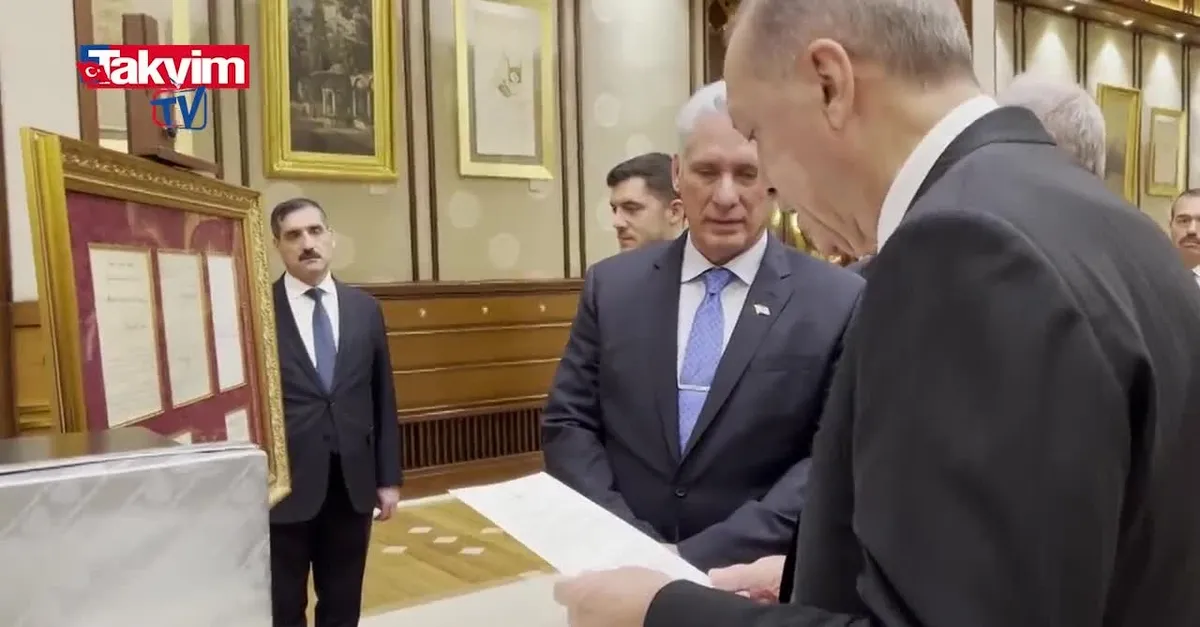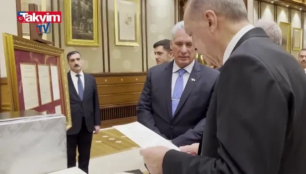 Başkan Recep Tayyip Erdoğan, Küba Devlet Başkanı Miguel Mario Diaz-Canel Bermudez ile Ankara'da bir araya geldi. İki lider önemli açıklamalarda bulunarak 6 anlaşma imzalandı. Görüşme sonrası Başkan Erdoğan, Küba Devlet Başkanı Miguel Mario Diaz-Canel Bermudez'e çok özel bir hediye takdim etti. 1902'de Küba Cumhurbaşkanı Tomas Estrada Palma'nın Osmanlı Padişahı II. Abdülhamid'e gönderdiği mektubu hediye etti.