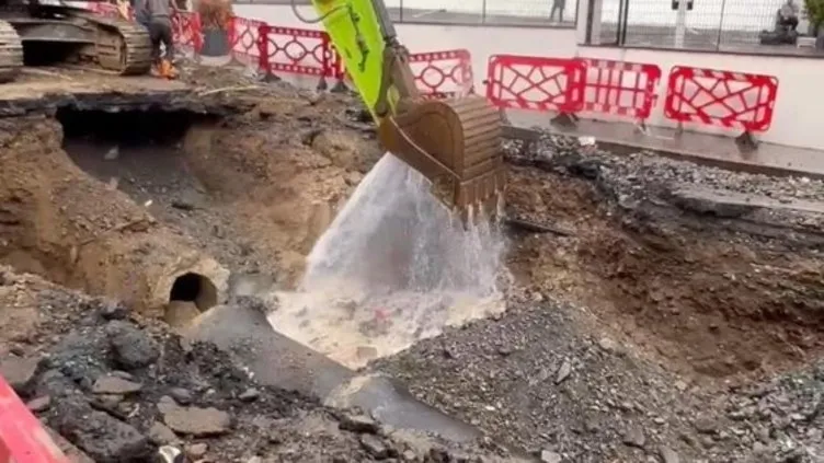 İstanbul'da İSKİ'ye ait su borusu yine patladı! Kepçeyle kapatarak önlenmeye çalışıldı..
