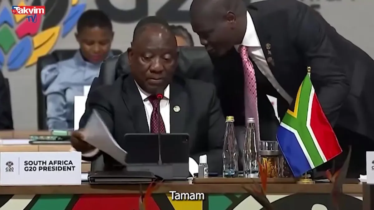 Güney Afrika Cumhurbaşkanı Cyril Ramaphosa, Johannesburg’daki G20 Zirvesi’nde zirveyi boykot eden ve bildiri yayımlanmasını istemeyen ABD Başkanı Donald Trump’ın baskısına rağmen ülkelerin büyük bölümünün ortak sonuç bildirisi yayımlanmasını istediğini söyledi. Ramaphosa, bu sözlerinin ardından kameraların kayıtta olduğuna dair uyarı alırken konuşmasını yalnızca liderlere yapmayı planladığı ortaya çıktı. İşte G20 Zirvesi'ne damga vuran kamera krizi..