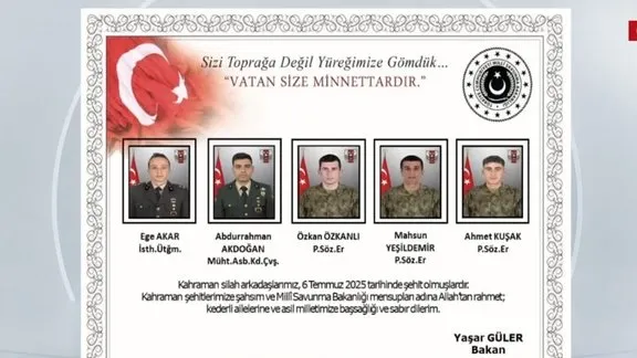Milli Savunma Bakanlığı, Pençe Kilit bölgesinde 2022'de şehit düşen P. Ütğm. Nuri Melih Bozkurt'un naaşını arayan 19 Mehmetçik'in metan gazına maruz kaldığını, 5 askerimizin şehit olduğunu duyurdu. Şehitlerimizin isimleri açıklandı.