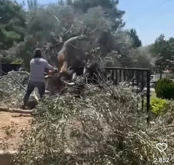 Videoda Bornova Belediyesi ekiplerinin zeytin ağaçlarını kestiği görüntüler yer aldı.
